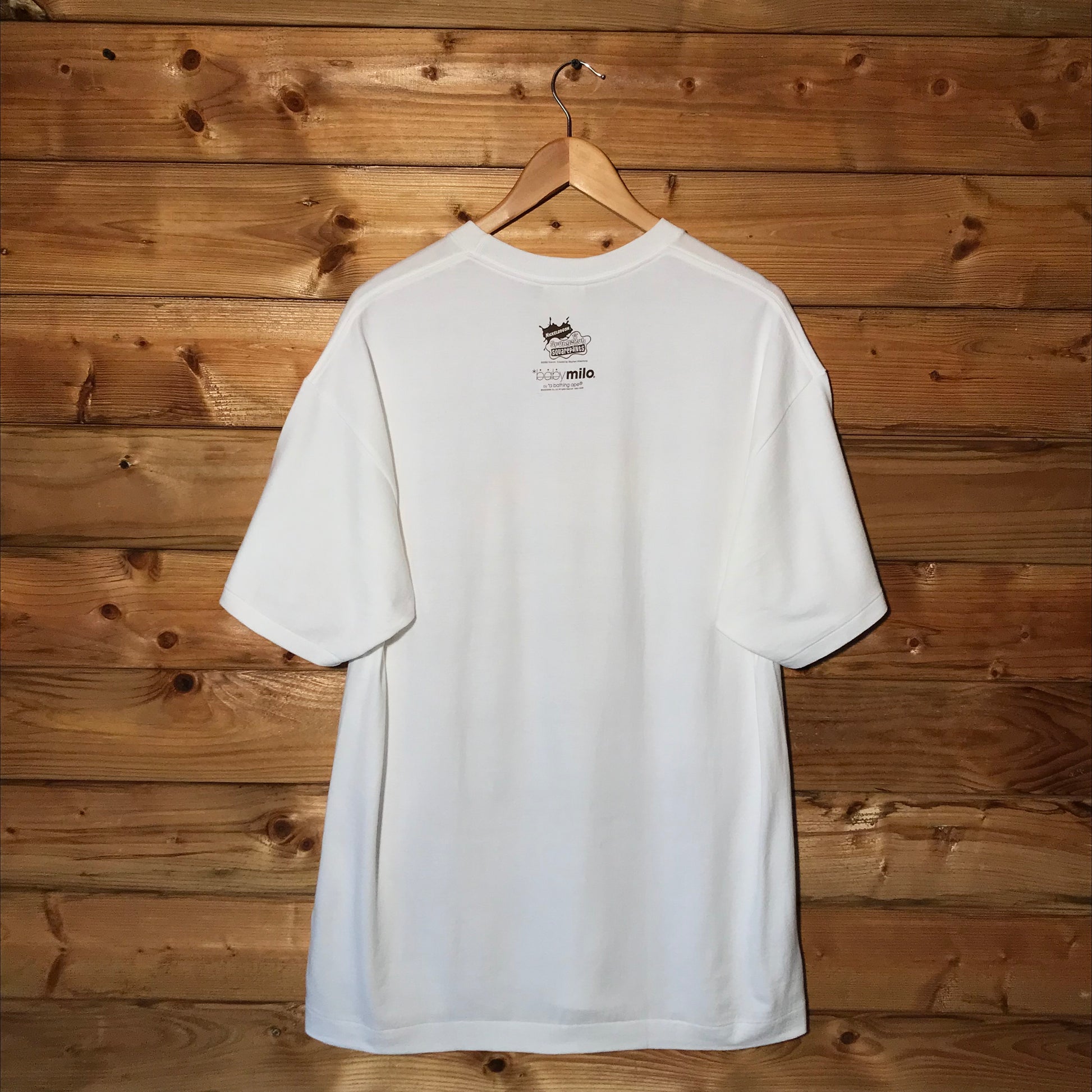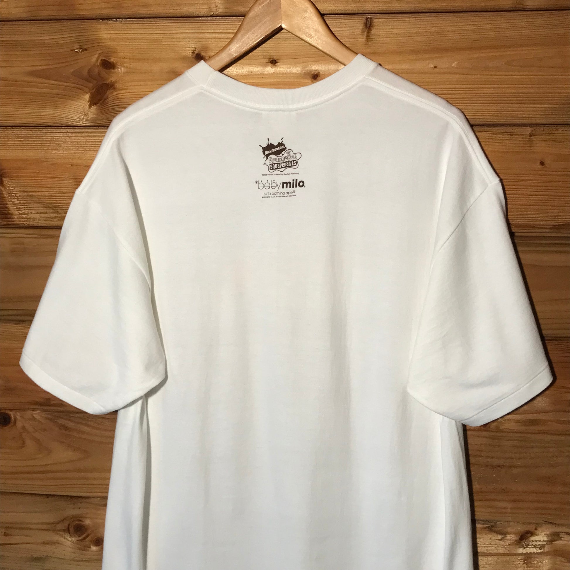 2008 2000s 00s White Baby Milo Bape by A Bathing Ape x Nickelodeon Spongebob Squarepants Cartoon Character Nigo's Favourite Shop Member's Exclusive S/S Short Sleeve T Shirt Tee with Black, Yellow and Brown Logo Graphics on front and back