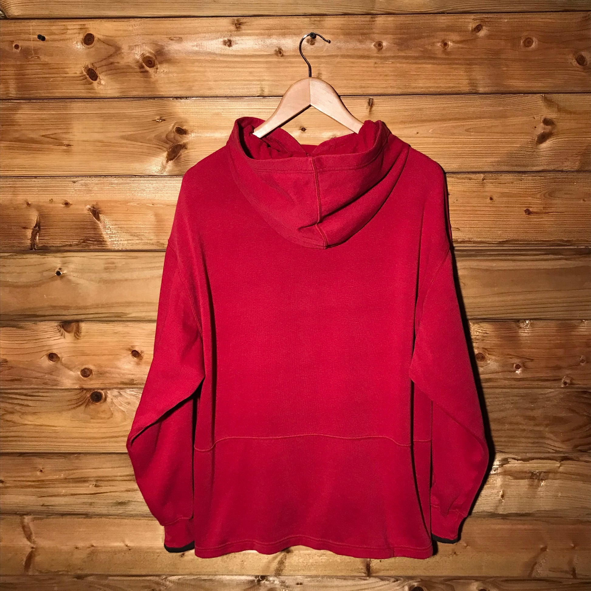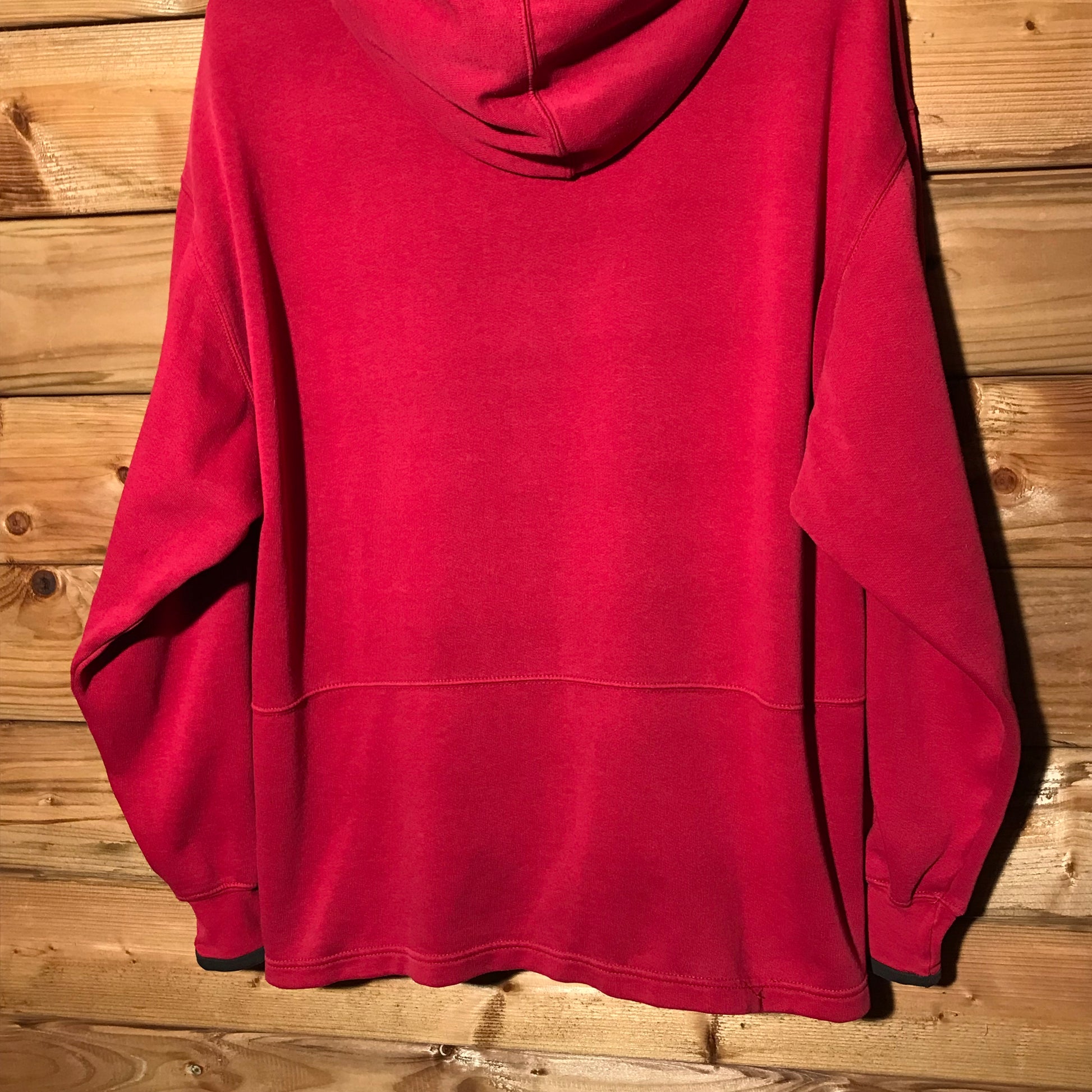 1990s 90s Red Nike Sports N Fitness Arc Spellouts Centre Swoosh Pullover Hooded Sweatshirt Hoodie with Blue, Yellow, Black and White Logo Embroidery on front and sleeve