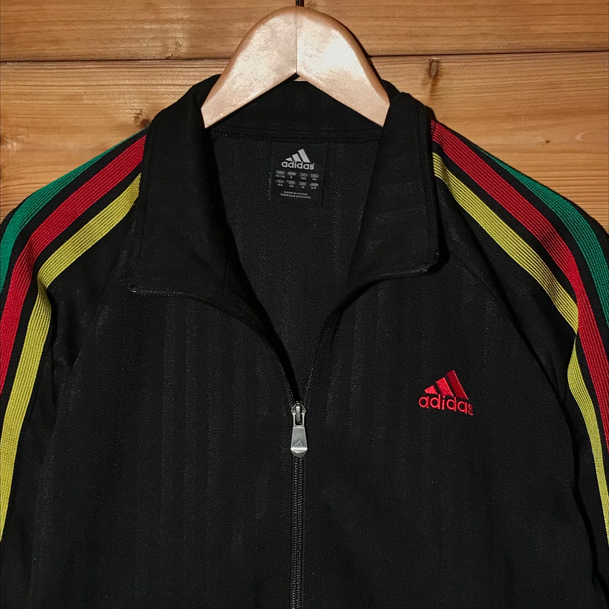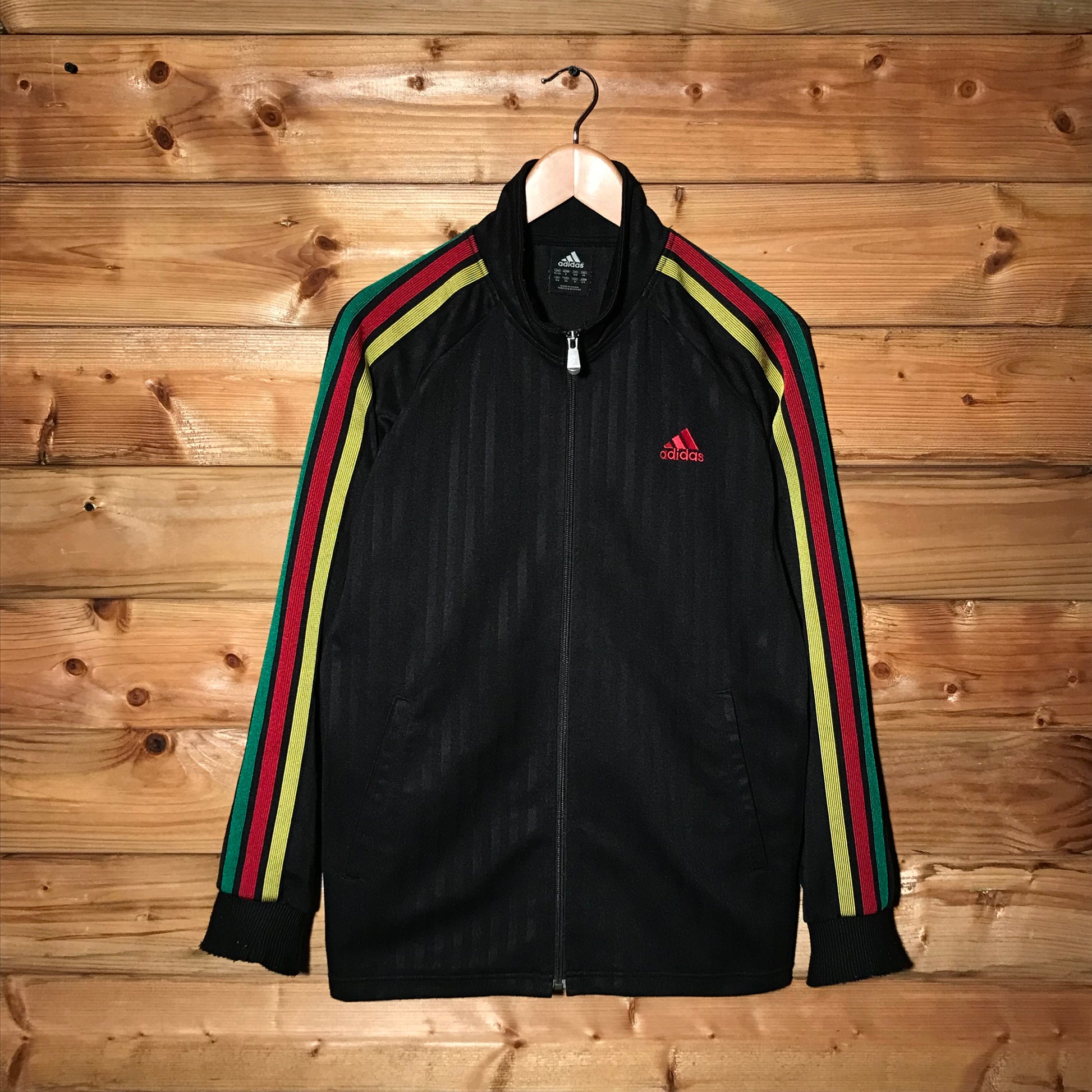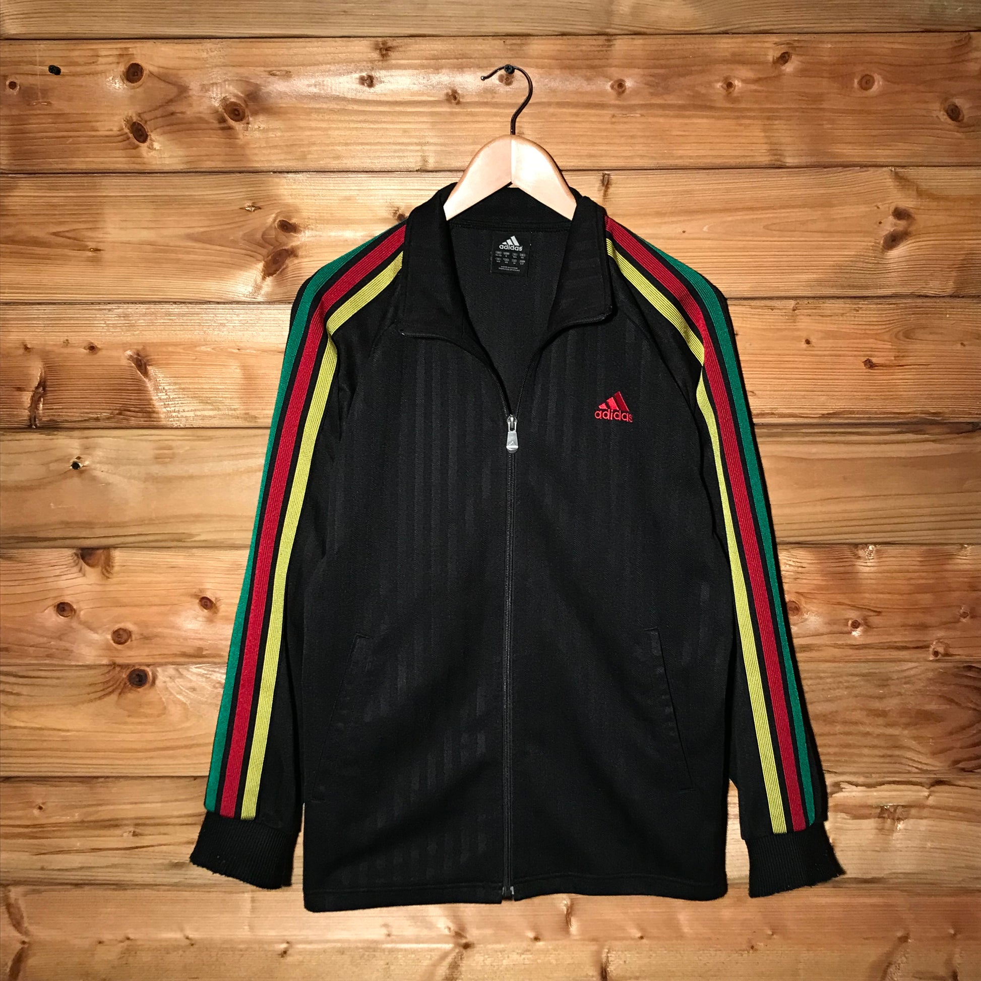 2000s 00s Black Adidas Originals Essentials Striped Full Zip Up Track Tracksuit Jacket Coat with Rasta Yellow, Green and Red Logo Embroidery on front