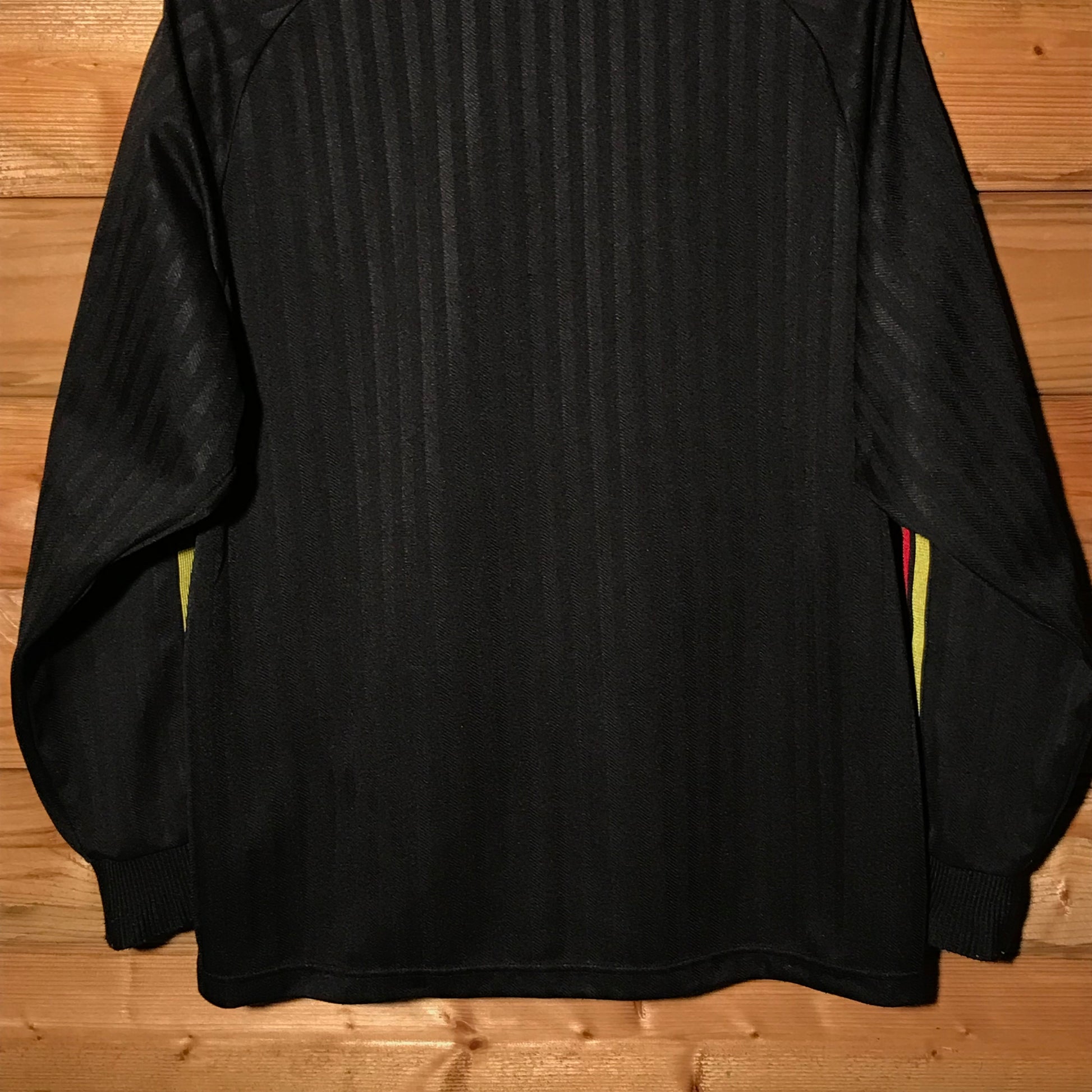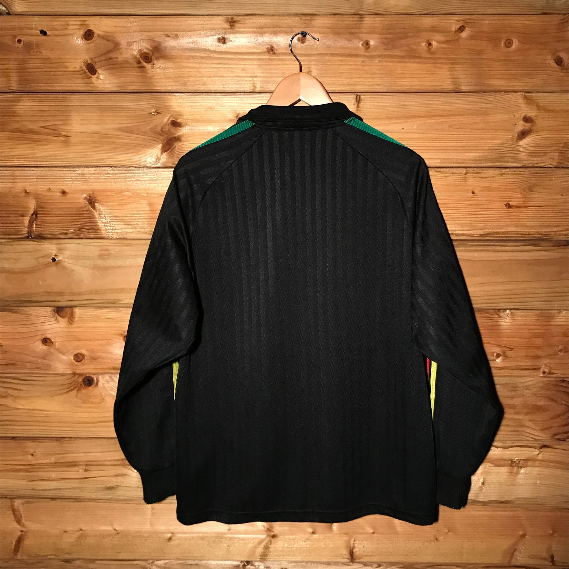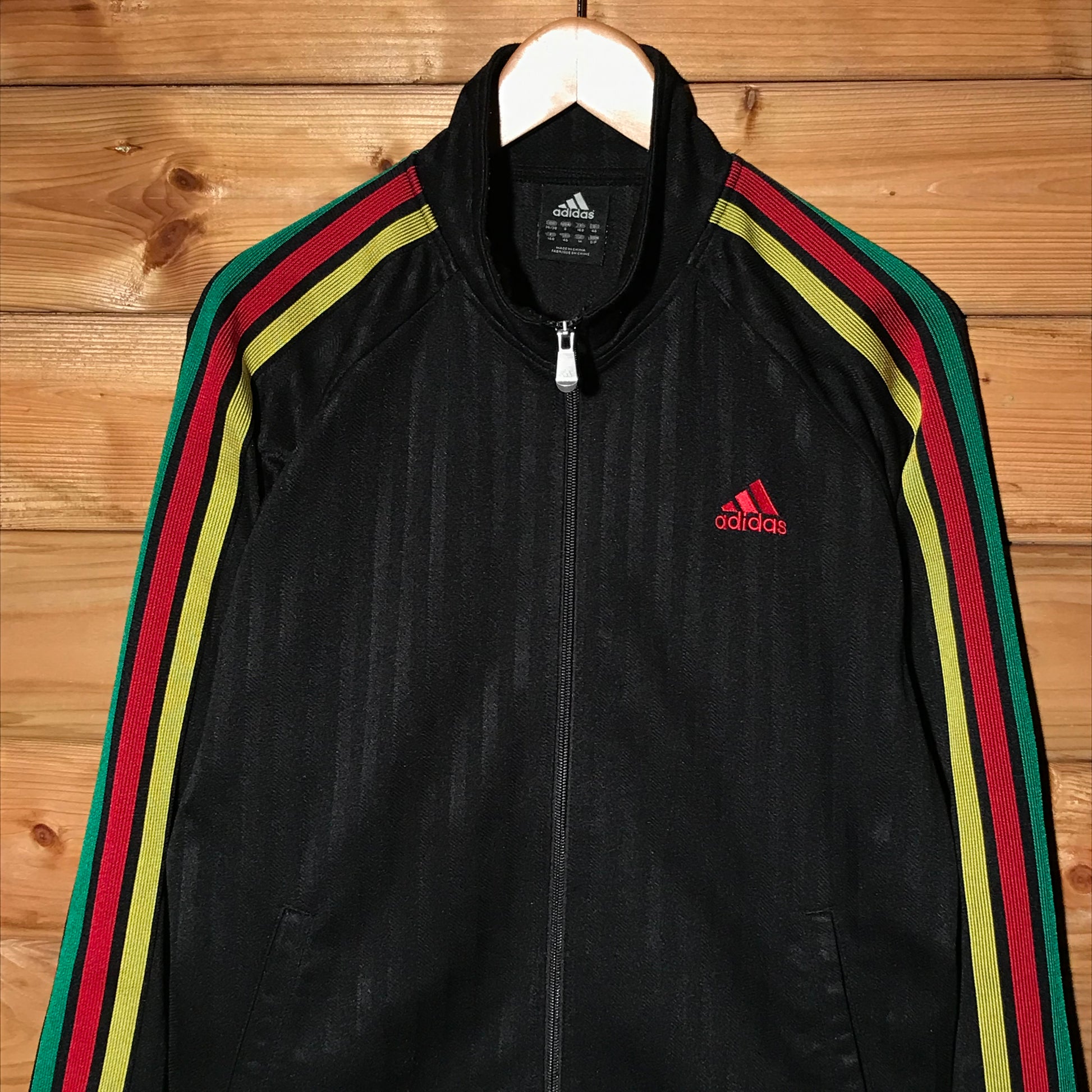 2000s 00s Black Adidas Originals Essentials Striped Full Zip Up Track Tracksuit Jacket Coat with Rasta Yellow, Green and Red Logo Embroidery on front