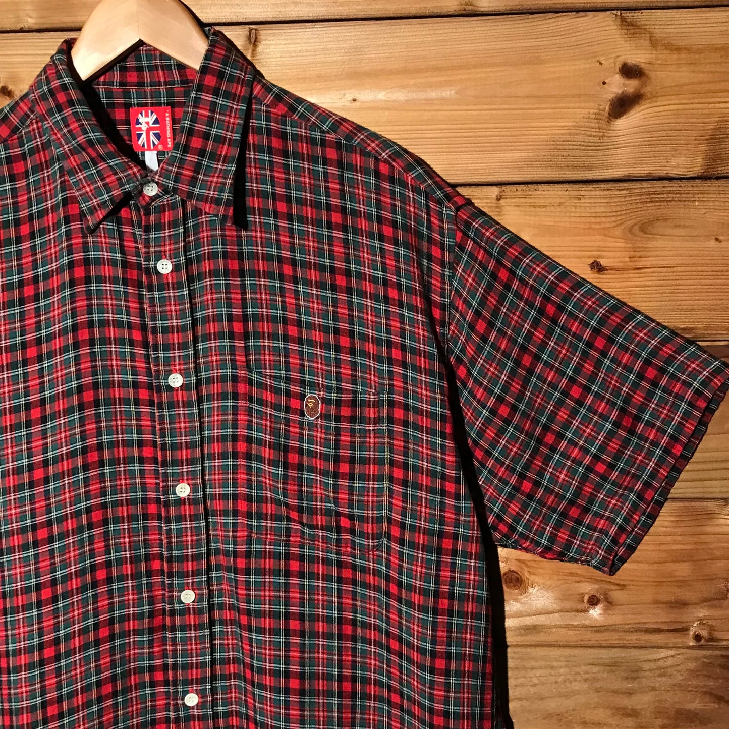 2000s 00s Red Bape by A Bathing Ape Plaid Tartan Check AOP All Over Print Pattern Short Sleeve Full Button Up Shirt with Green, White and Brown Logo Embroidery on front pocket