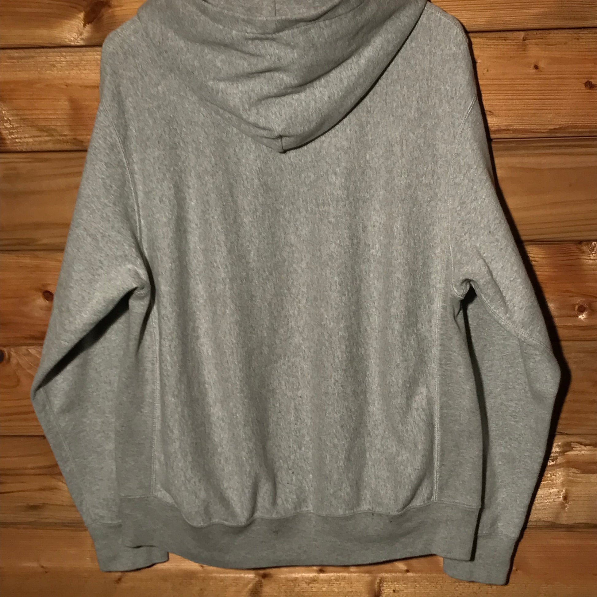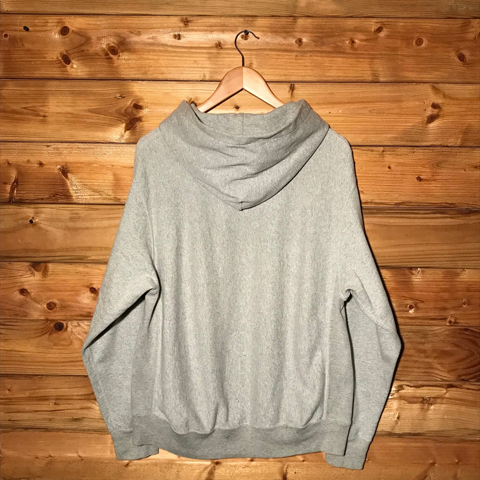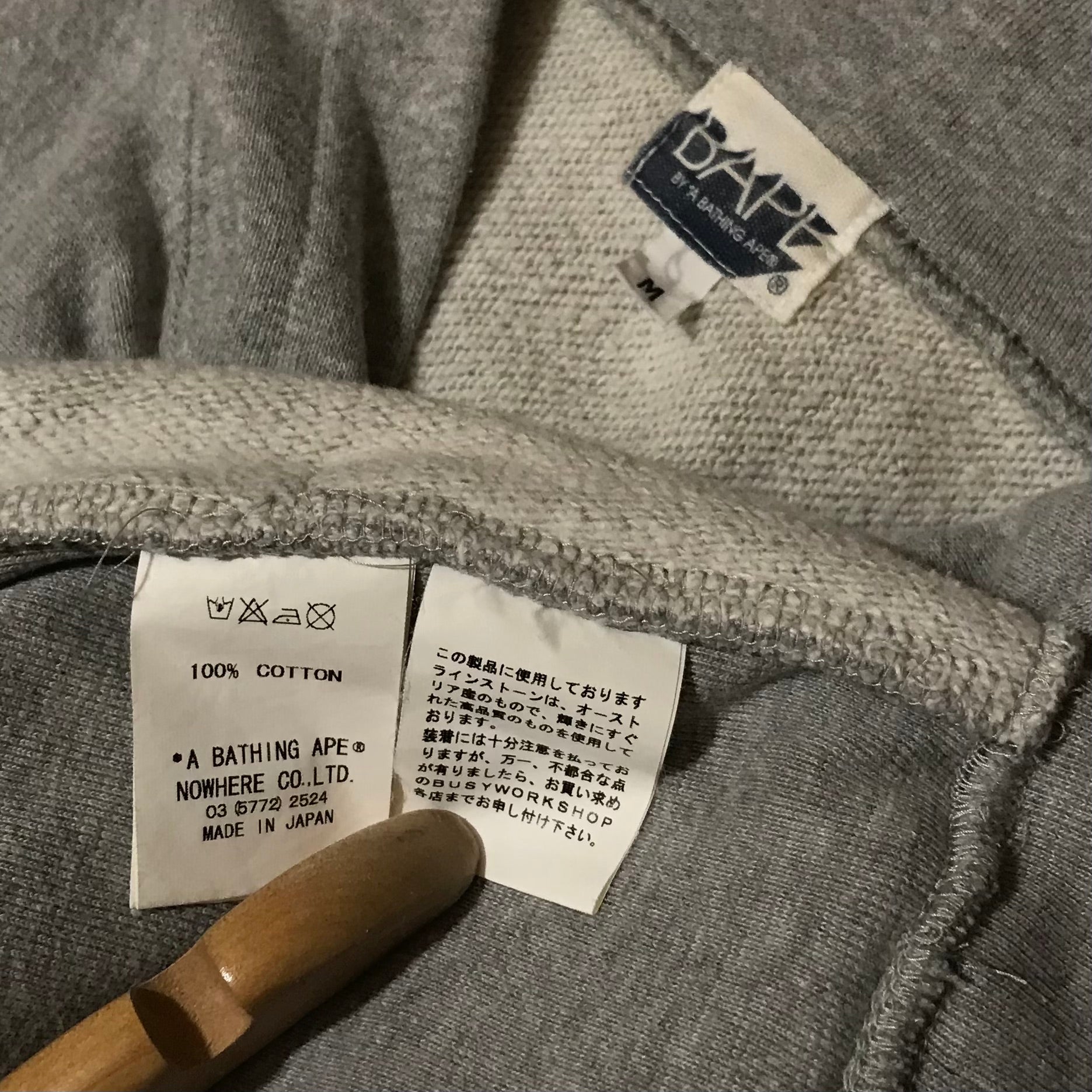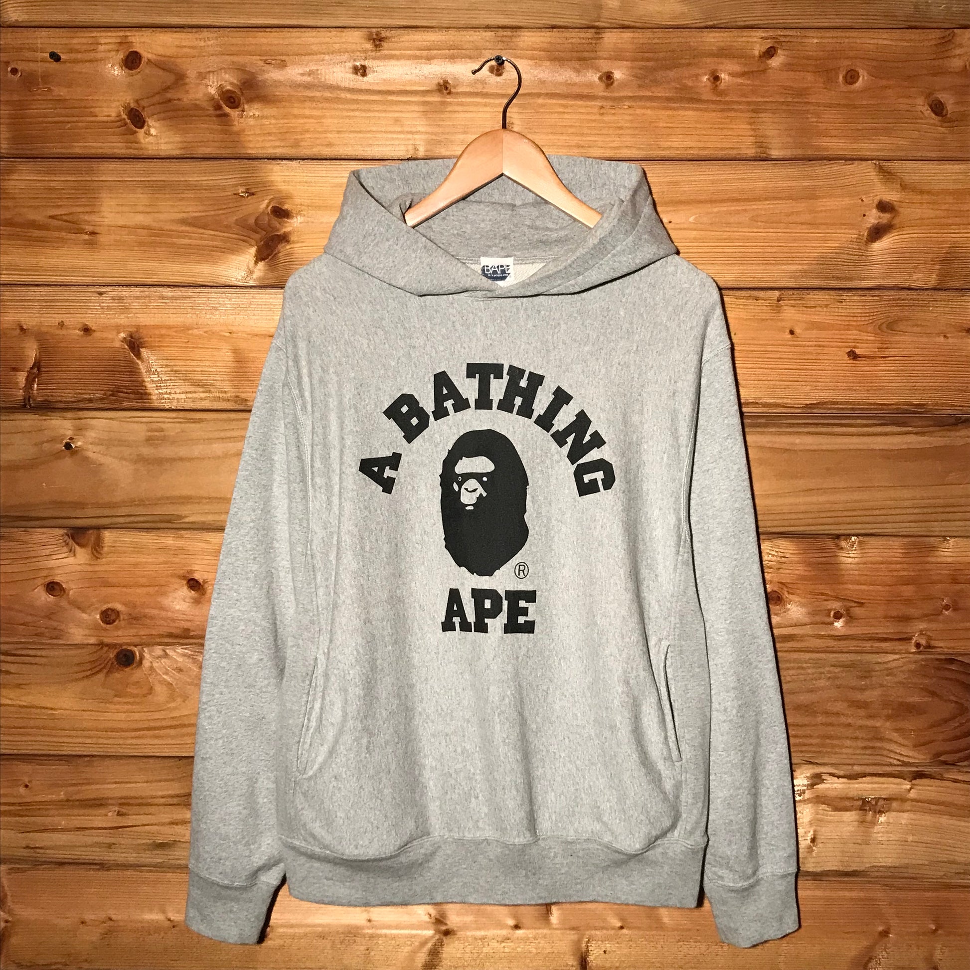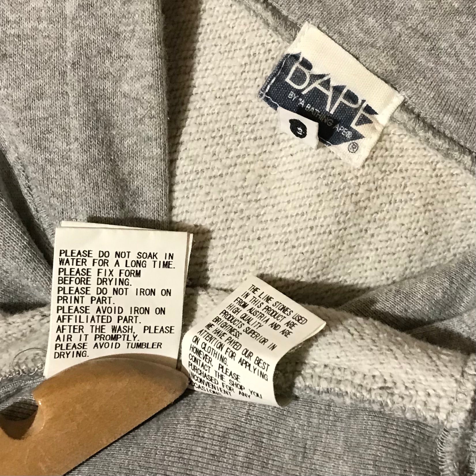 2000s 00s Grey Bape by A Bathing Ape Swarovski Crystal Eyes College Arc Spellout L/S Long Sleeve Pullover Hooded Sweatshirt Jumper Hoodie with Black Logo Graphics on front