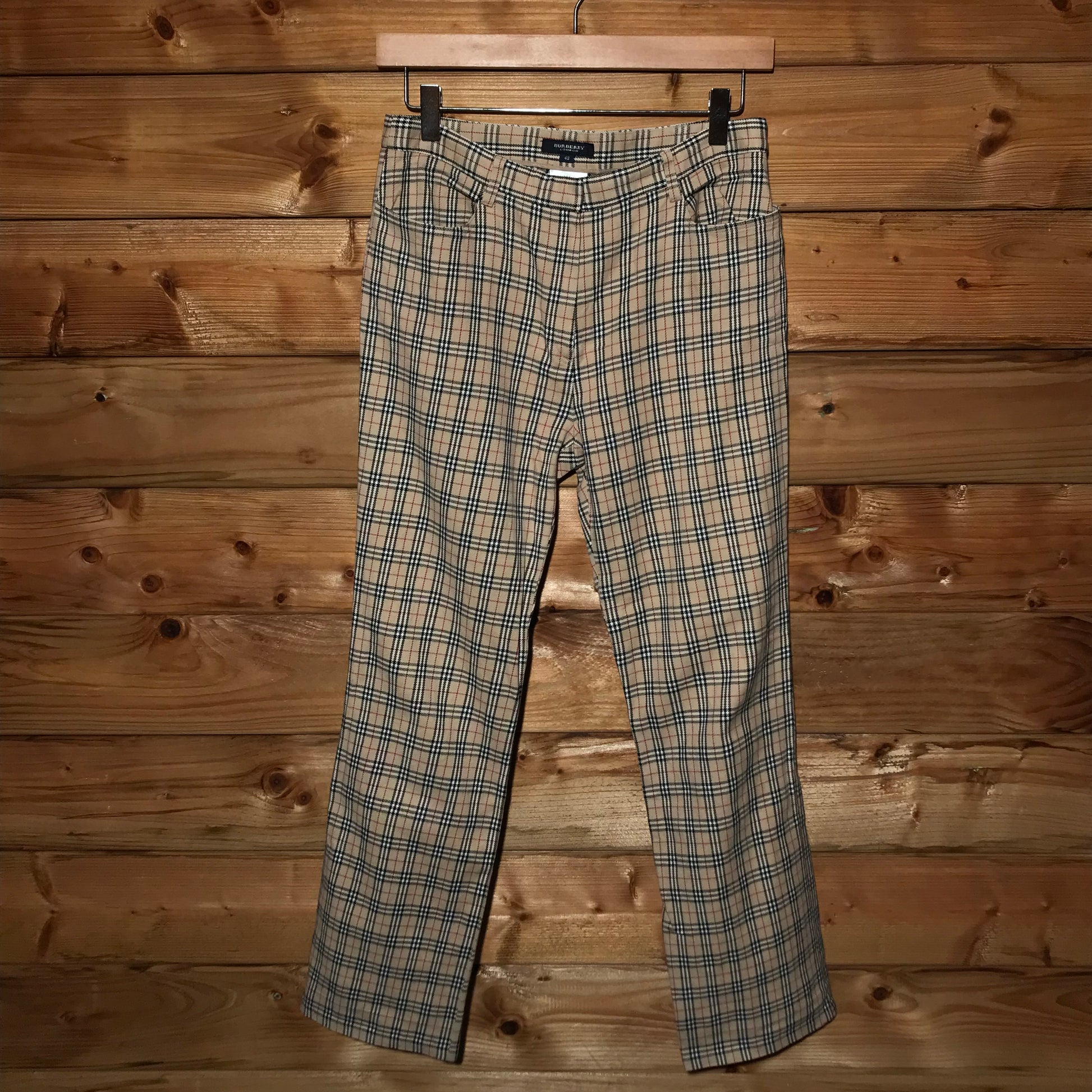 2000s 00s Beige Tan Brown Burberry Burberrys of London Classic Nova Check Checked Checkered Plaid Tartan Striped AOP All Over Print Pattern Golf Golfing Style Trousers Bottoms Pants with Black, White and Red Design Details
