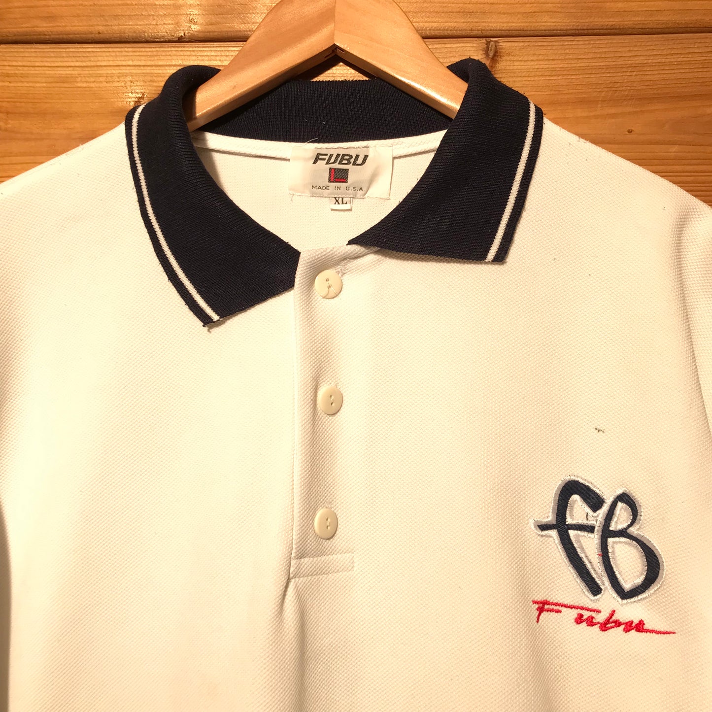 White Fubu Button Up Long Sleeve Polo t shirt with Red and Black Logo Embroidery on front