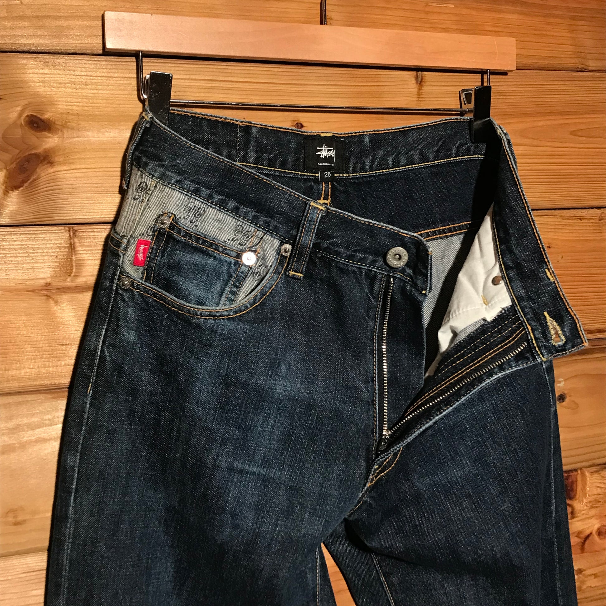 10s 2010s Dark Blue Stussy Garment Co Company California USA United States Of America Built Tough Registered Trademark Rough And Rugged Levis Levi's Strauss Style Patch Parody Rip Double S Link Logo Monogram Repeat Pattern Waist Denim Jeans Trousers Bottoms Pants with Grey Logo Embroidery on Back Pocket
