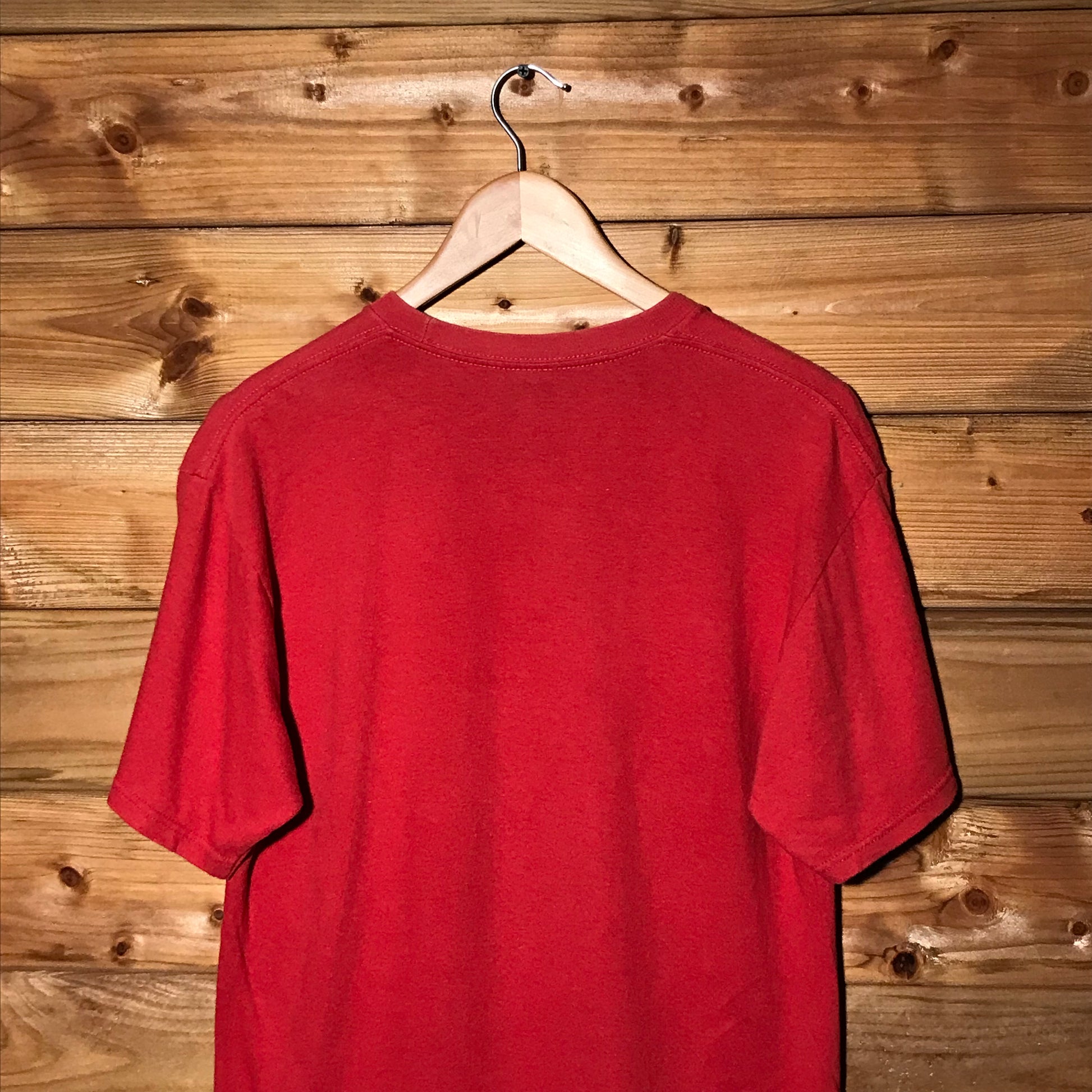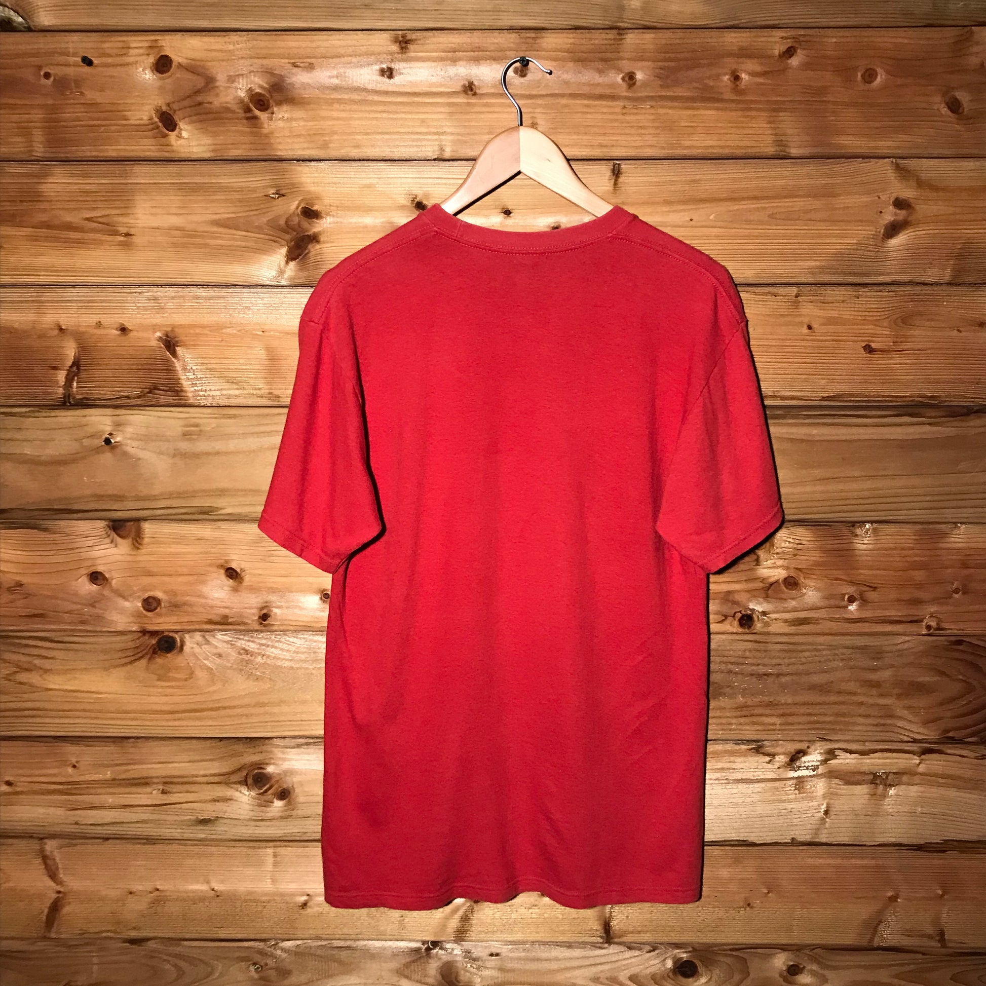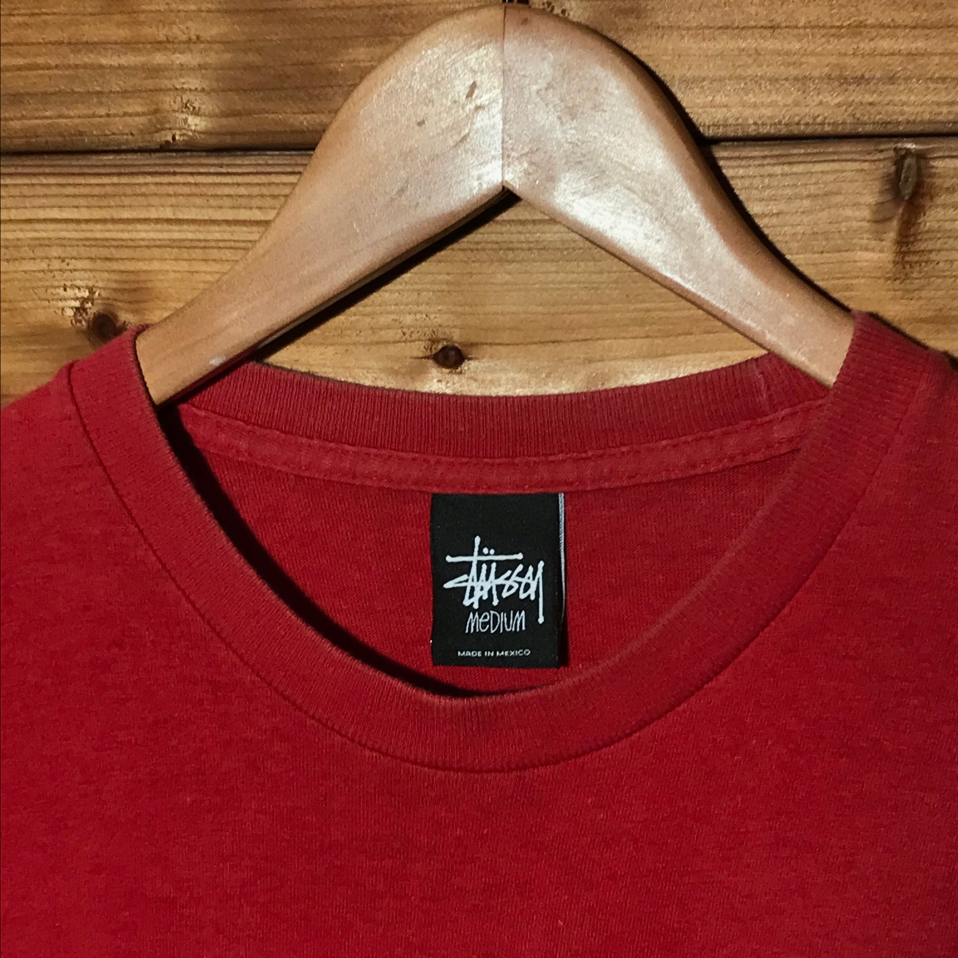 2010s Red Stussy Split Halved Sprayed Drip Graffiti Centre Script Spellout T Shirt Tee with Black Logo Graphics on front